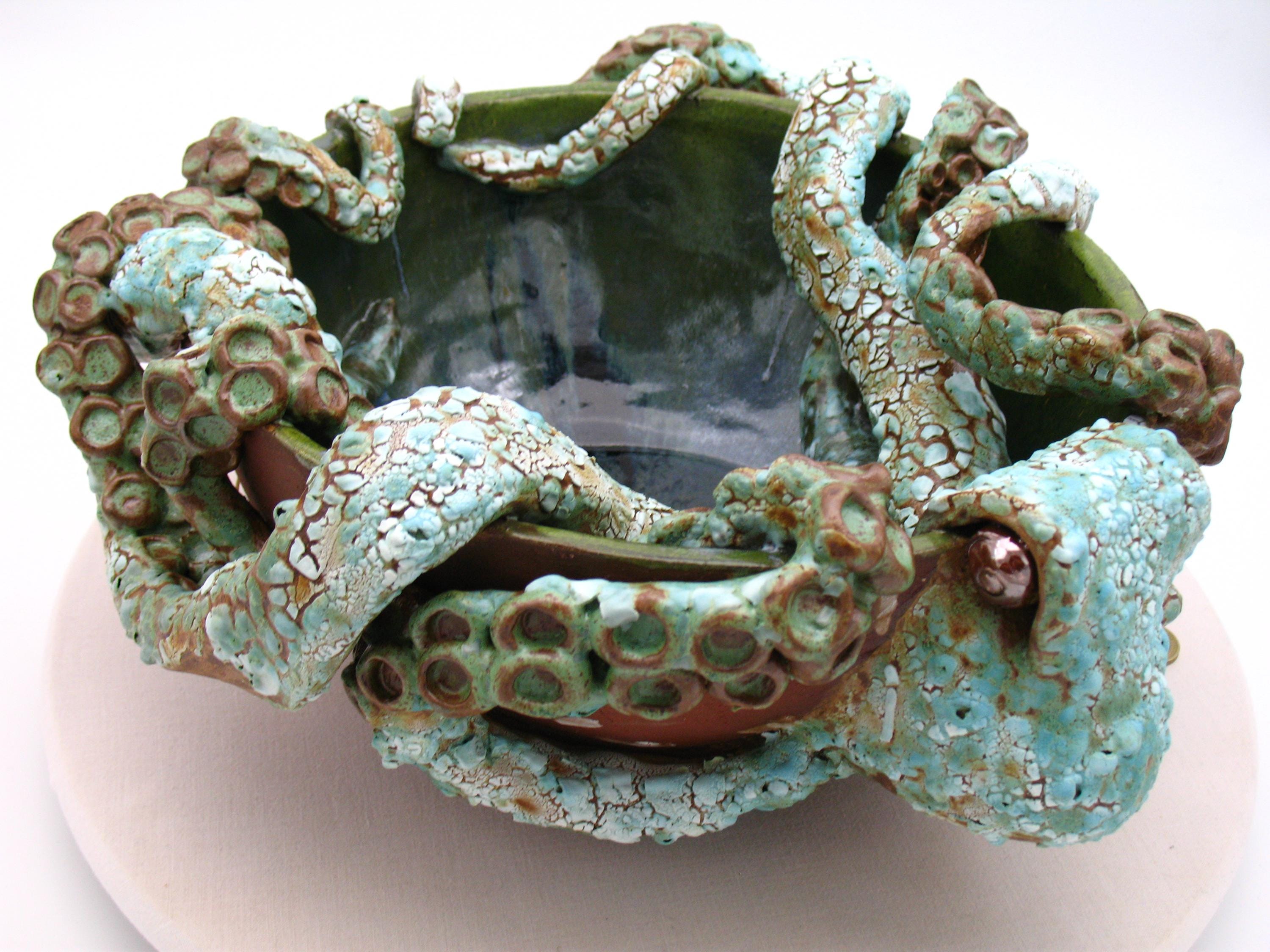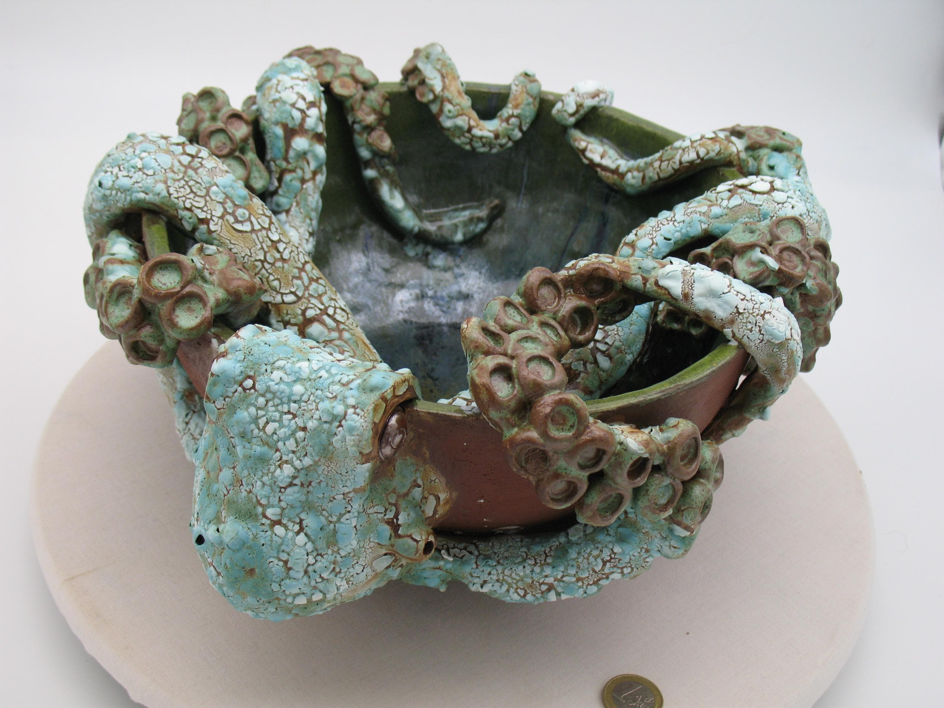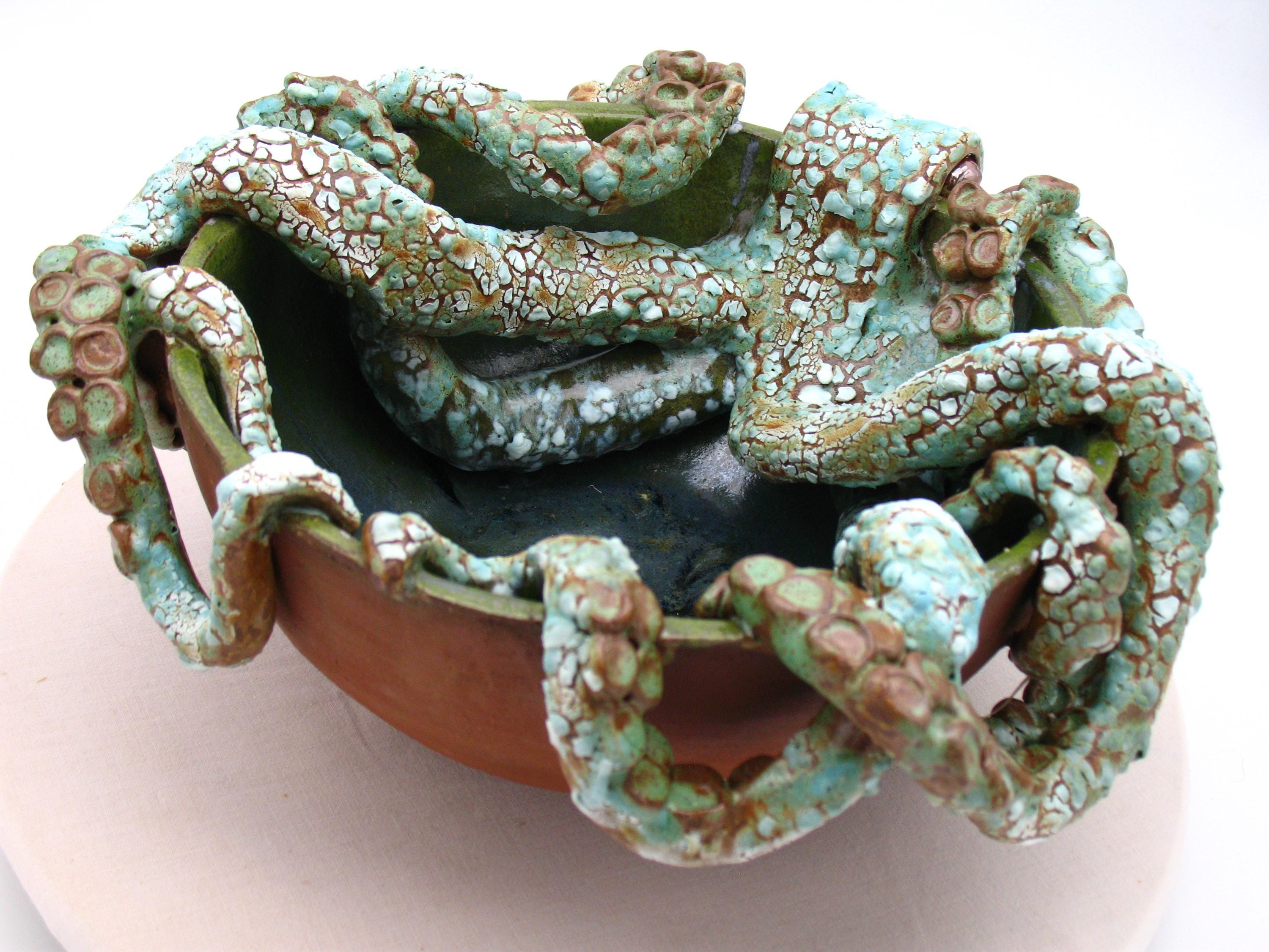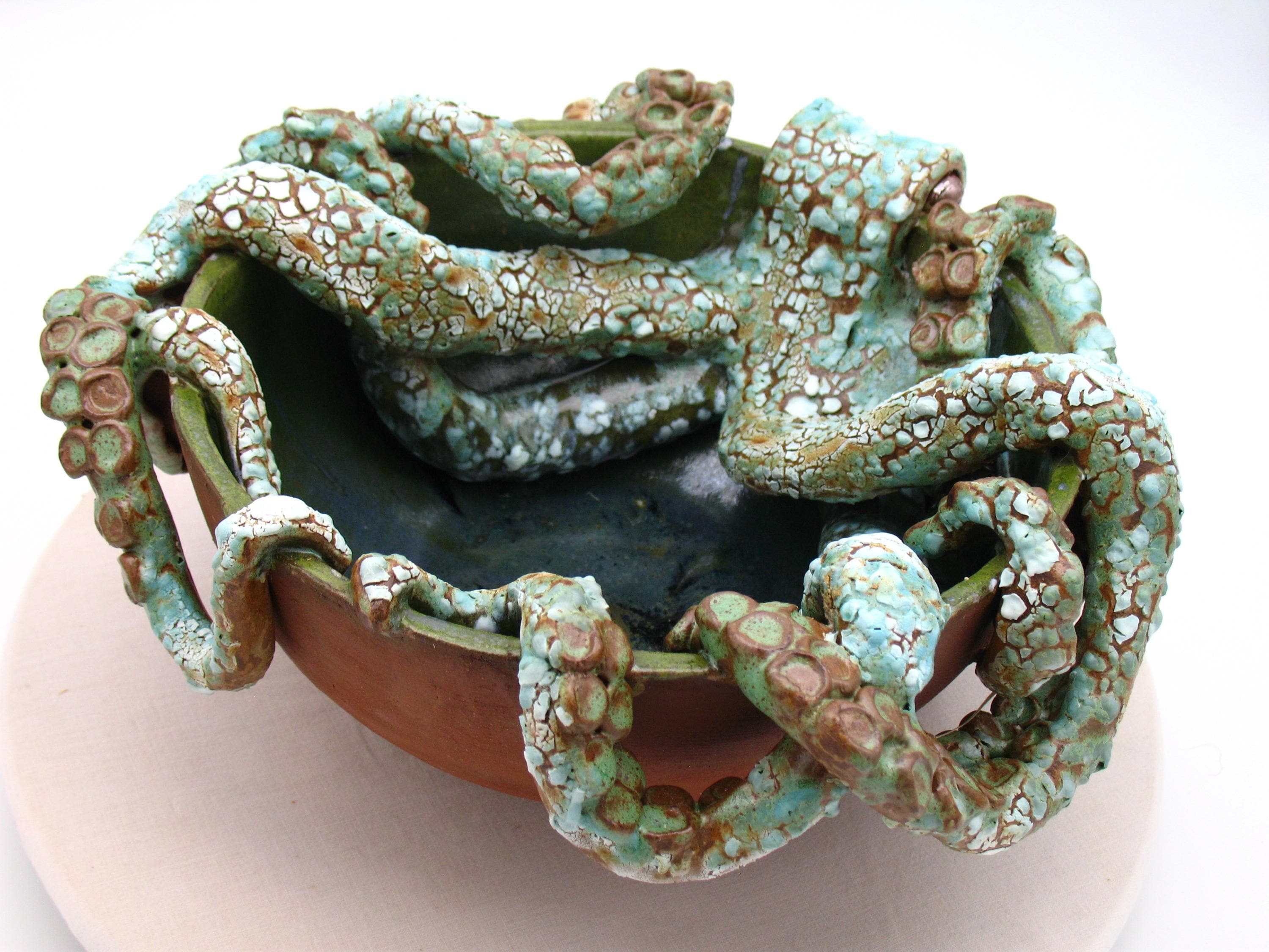A statement bowl, 30 cm in diameter and weighing 5 kg, it demands space. Completely handmade, with a special glaze on the octopus. Inside, the bowl has a beautiful sea-green glaze, while the natural clay is visible on the outside, showcasing its color and texture.